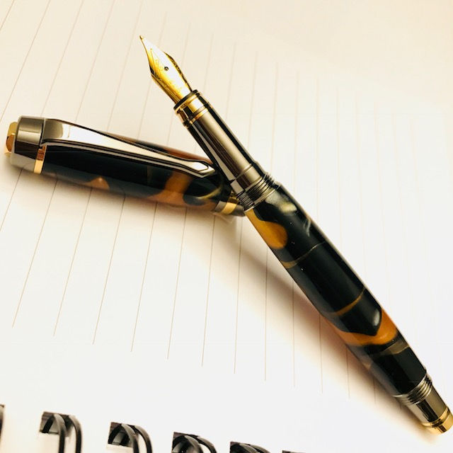 The Fountain Pen is a writing instrument equipped with a metal nib that utilizes an ink cartridge or a reservoir that holds water-based liquid ink. The ink passes through the feed to the nib with the help of gravity. Fountain pens are very popular with writers that enjoy the smooth flow of ink. We use German-made steel nibs featuring two tone 24k Gold/Rhodium or Iridium platings.